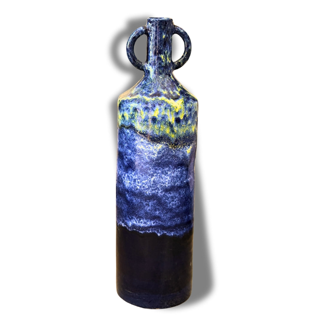 Ajoutez une touche de caractère à votre intérieur avec ce grand vase artisanal marocain, une pièce unique en céramique émaillée, peinte à la main. Ce vase se distingue par sa forme élancée et ses deux anses circulaires, rappelant les amphores traditionnelles berbères.