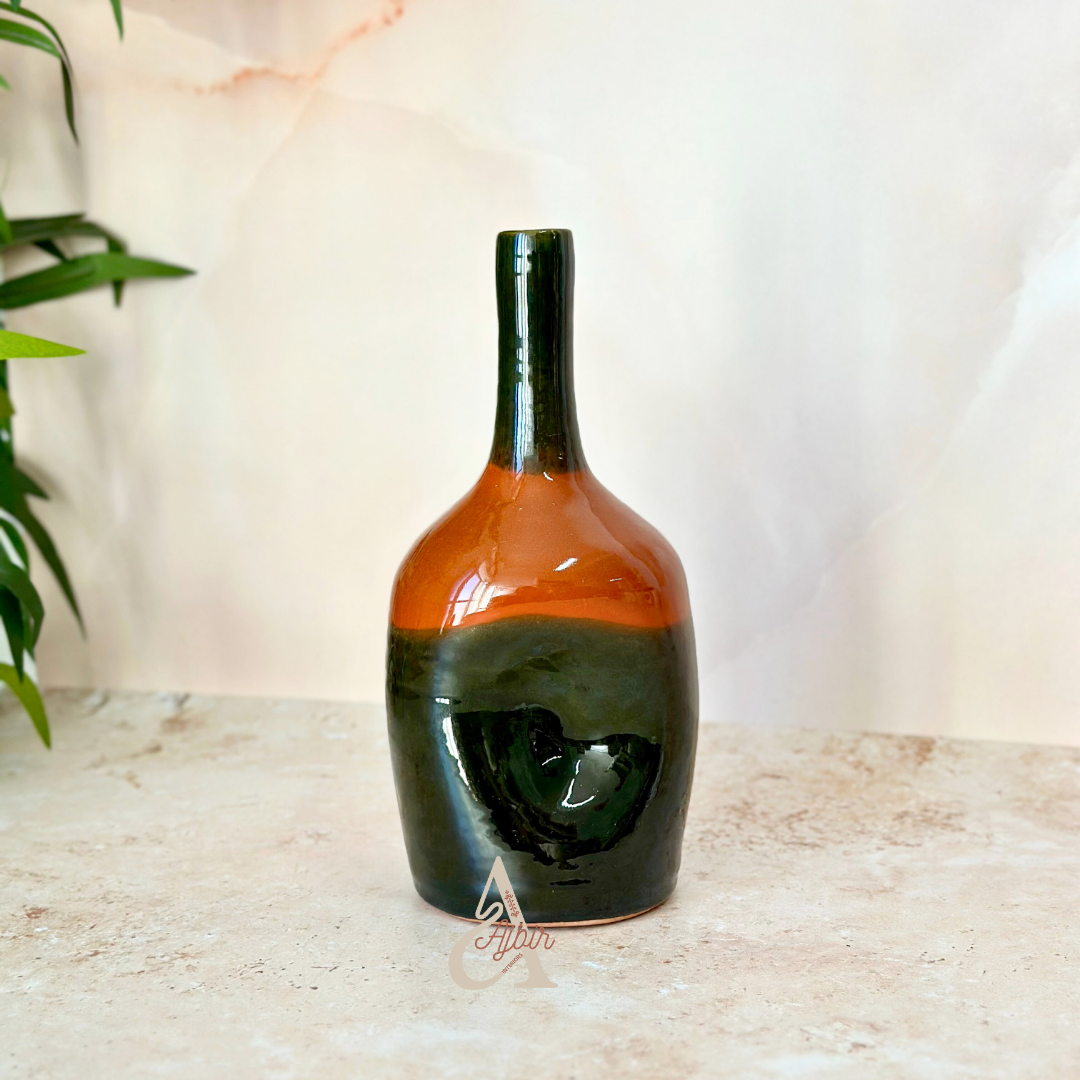 Découvrez le Vase artisanal bouteille vert kaki et terracota, une pièce d’exception façonnée à la main par des artisans marocains. Ce vase se caractérise par l’harmonie subtile entre ses teintes vert kaki et terracota, créant un contraste élégant et naturel qui saura sublimer votre décoration intérieure. Sa forme de bouteille et sa finition soignée en font un objet décoratif idéal pour mettre en valeur vos compositions florales ou apporter une touche d’authenticité à votre espace de vie. Un véritable hommage au savoir-faire artisanal, alliant tradition et modernité.