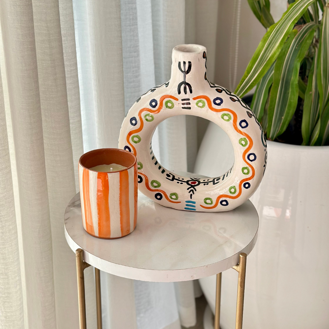 Le Vase artisanal Tafoukt Amazigh Batul, en forme de donut, est une pièce unique qui apportera une touche moderne et authentique à votre décoration. Fabriqué en terre cuite par des artisans marocains, ce vase illustre parfaitement l'artisanat Amazigh. Son design original et sa finition soignée en font une pièce centrale dans toute pièce de votre maison. Parfait pour les fleurs séchées, il s'intégrera parfaitement dans un style de décoration bohème, minimaliste ou traditionnel. Chaque vase est fabriqué à la main, ce qui garantit son unicité et sa qualité.
