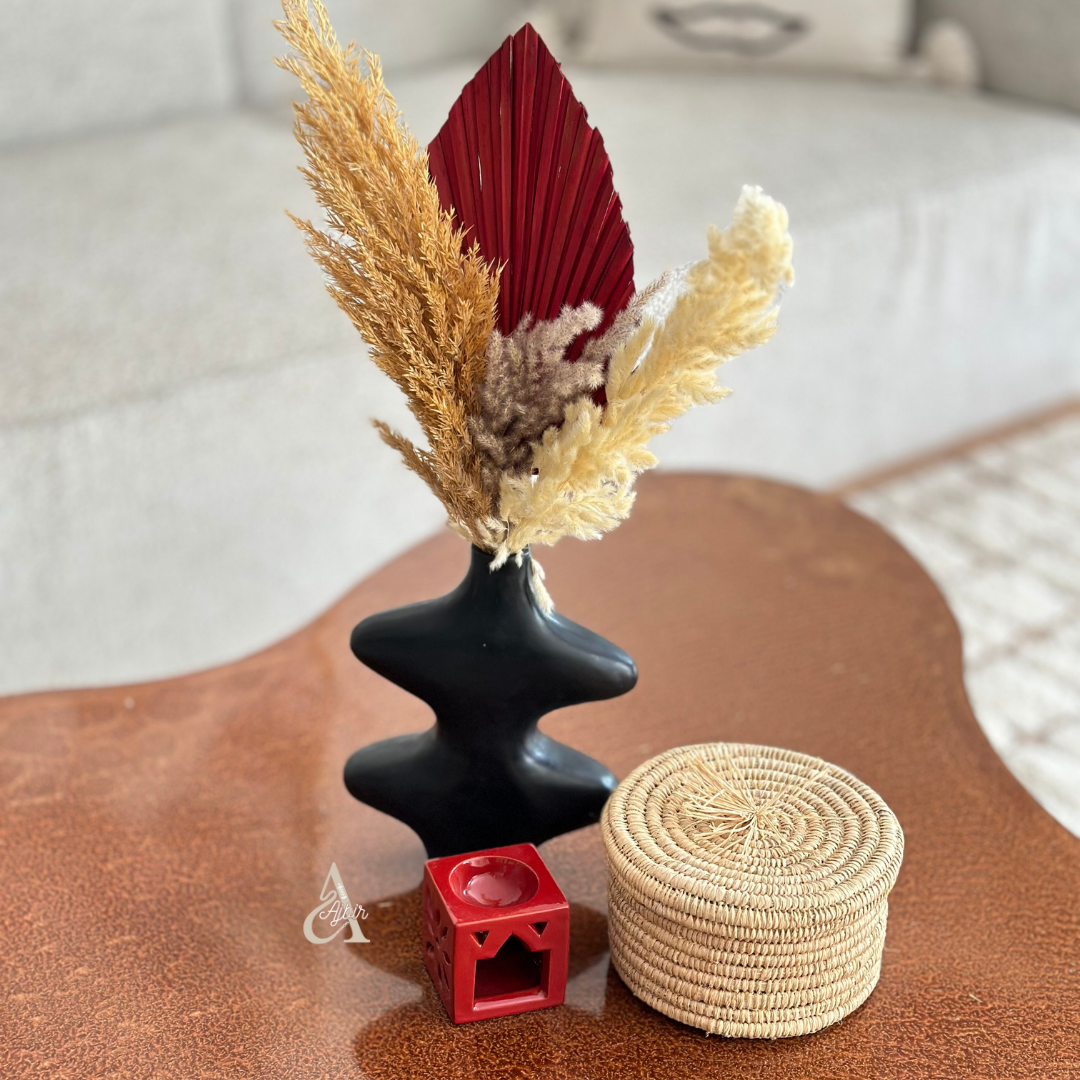 Le Vase artisanal Tayyugt incarne l’authenticité et la durabilité, s’intégrant parfaitement dans une décoration bohème, berbère, ou contemporaine. Que ce soit pour un salon, une chambre ou une table basse, il offre une alliance parfaite entre tradition et modernité, tout en valorisant le patrimoine marocain.